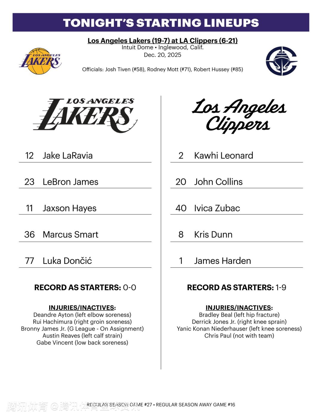 2025-12-21 12:00北京时间12月21日,NBA常规赛继续进行,湖人队对阵快船队。赛前,双方公布了本场比赛的首发名单。