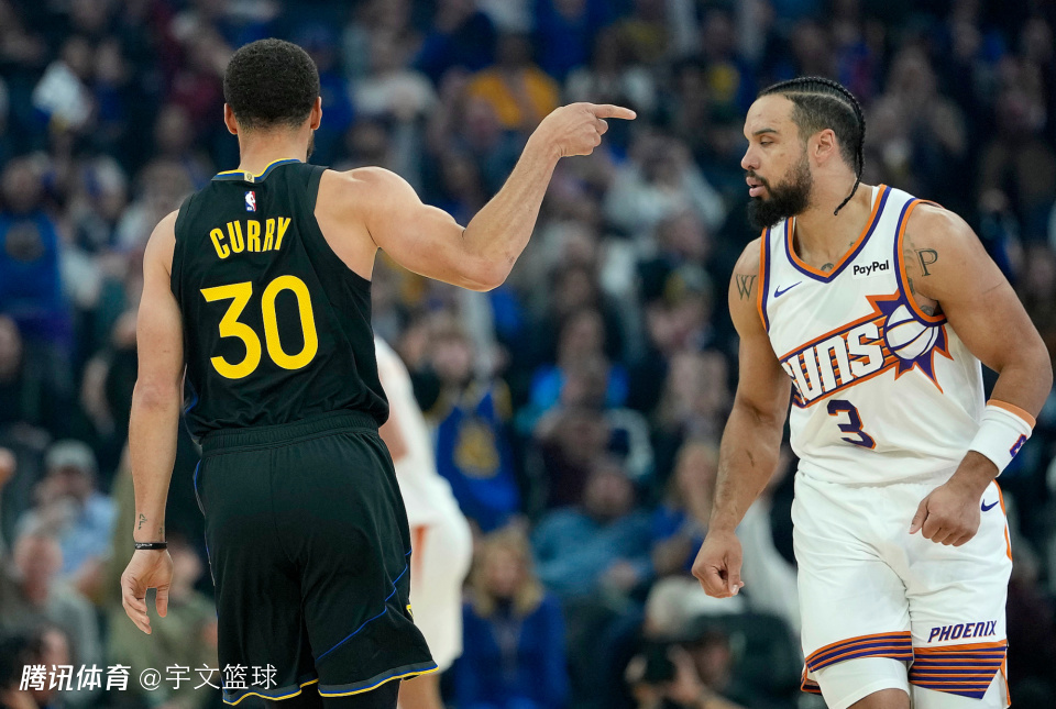 末节比赛,库里携手桑托斯连续飙进三分,勇士一度拉开分差到双位数。太阳在布克的带领下试图缩小分差,但是库里用中距离投篮还以颜色,比赛最后时刻成为了库里和布克的巨星对飙舞台,太阳在最后时刻顽强地缩小分差到2分。