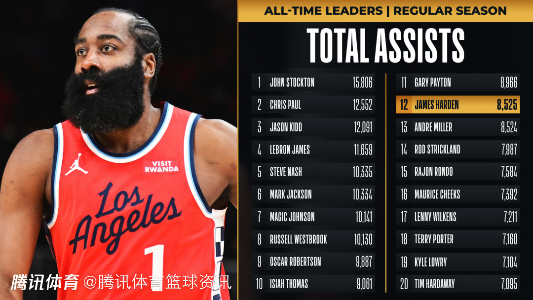 2025-12-21 13:20北京时间12月21日,NBA常规赛继续进行,快船队对阵湖人队。第三节比赛开始后,哈登送出职业生涯第8525次助攻,超越安德烈-米勒,升至NBA历史助攻榜第12位。