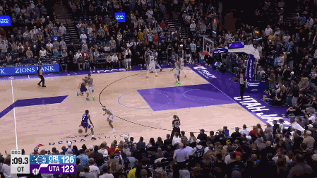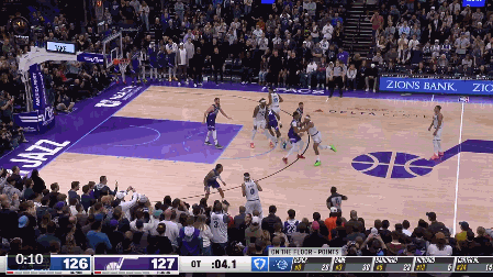 在比赛结束前14.1秒,安东尼-布莱克两罚一中,让魔术队126-123领先1分。爵士队将关键一攻交给基扬特-乔治,他运球杀到前场,用假动作点飞安东尼-布莱克之后,在造犯规的同时将球神奇投中,之后还加罚得手,这次神奇的3+1,帮助爵士队127-126反超1分。