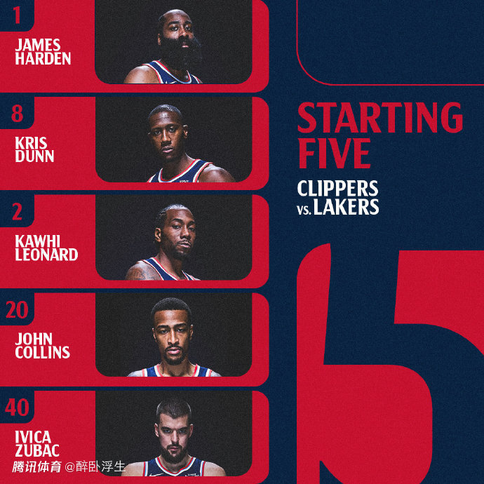 快船:莱昂纳德、科林斯、祖巴茨、邓恩、哈登