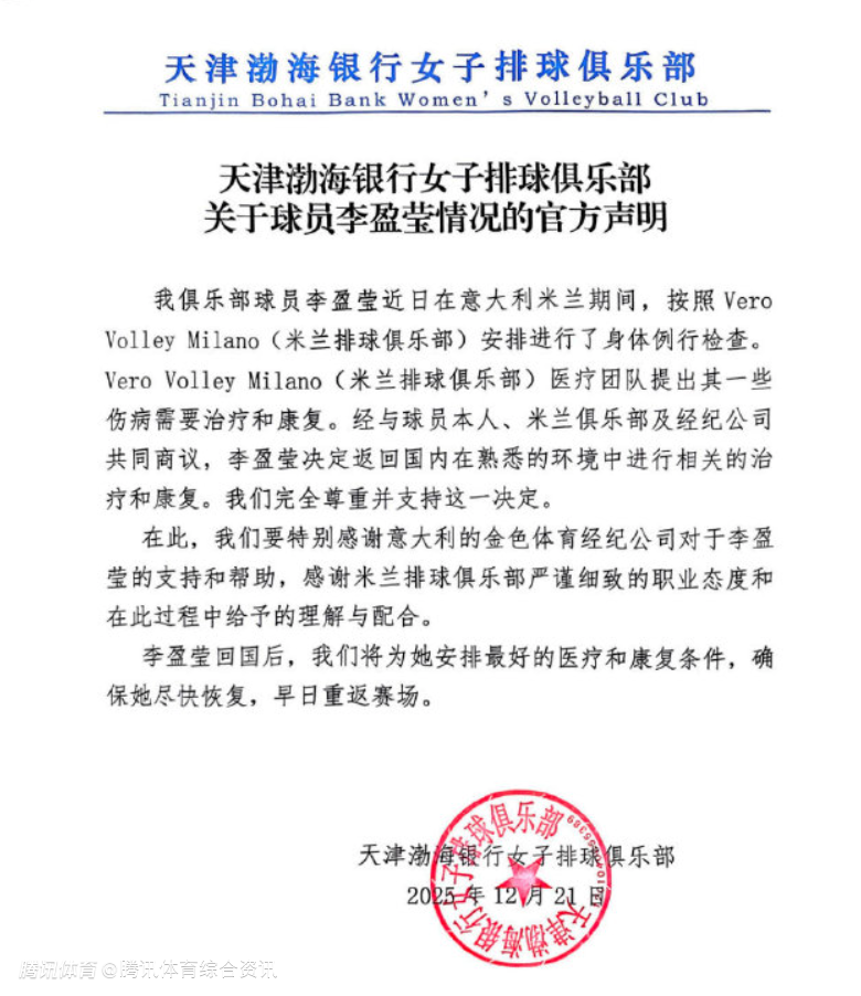 我俱乐部球员李盈莹近日在意大利米兰期间,按照 Vero Volley Milano(米兰排球俱乐部)安排进行了身体例行检查。Vero Volley Milano(米兰排球俱乐部)医疗团队提出其一些伤病需要治疗和康复。经与球员本人、米兰俱乐部及经纪公司共同商议,李盈莹决定返回国内在熟悉的环境中进行相关的治疗和康复。我们完全尊重并支持这一决定。
