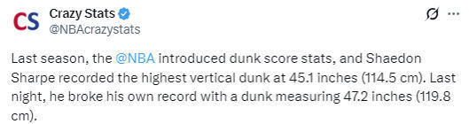 该媒体发文写道:“上个赛季,NBA推出了扣篮统计数据,夏普创下了45.1英寸(114.5厘米)的最高垂直扣篮高度纪录。昨晚,他以一次47.2英寸(119.8厘米)的扣篮打破了自己的纪录。”