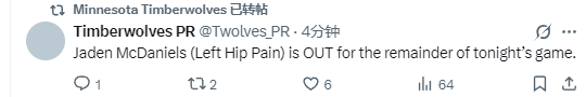 森林狼官方:麦克丹尼尔斯左髋部疼痛 退出与雄鹿的剩余比赛