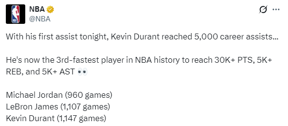 3、杜兰特用了1147场,成为史上第三快达成30000分5000助攻5000篮板的球员,仅次于乔丹