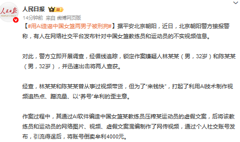 利用AI技术造谣中国女篮!人民日报:两男子已被朝阳警方依法刑事拘留