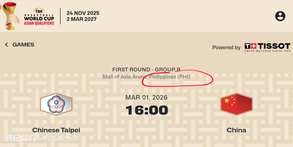 2025-12-22 21:30北京时间12月22日,FIBA更新了中国男篮世预赛第四战客场挑战中国台北的比赛,将会于2026年3月1日在菲律宾的亚洲购物中心体育馆举办。