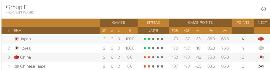 中国台北同样是2战全负,净胜分为-33分,排在小组第四。