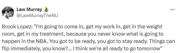至于备战状态,大洛透露自己一直保持着规律且严谨的节奏:“训练、力量房加练、理疗康复,这些该做的事我都会按部就班完成。NBA的局势变化太快了,你永远不知道下一秒会发生什么,必须时刻保持最佳备战状态,随时准备上场。我相信全队都已为明天的比赛做好了准备。”