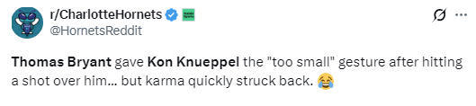 这搞笑的一幕也引发了网络热议,黄蜂队官方社媒也晒出了相关视频并发文写道:“托马斯-布莱恩特在克努佩尔头顶命中一记进球后,对其比出了‘too small’的嘲讽手势,但‘报应’来得猝不及防。”