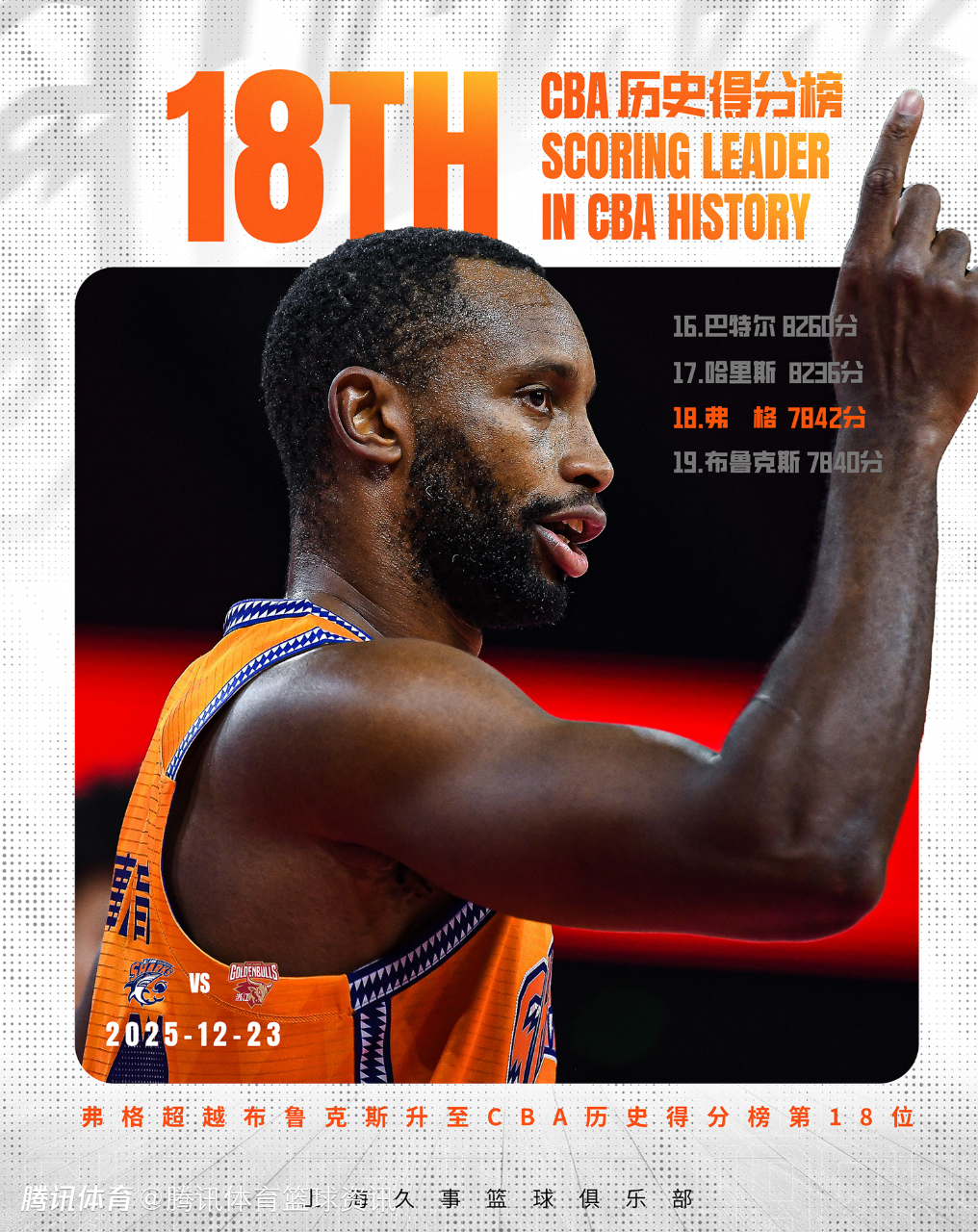 第三节,弗格命中一记三分球,让自己的CBA生涯总得分来到7842分,超越前广东外援马尚-布鲁克斯,升至CBA历史得分榜第18位,排在他之前的是曾经帮助四川夺得总冠军的迈克-哈里斯(8236分),而排在第16位的则是中国男篮名宿巴特尔(8260分)。