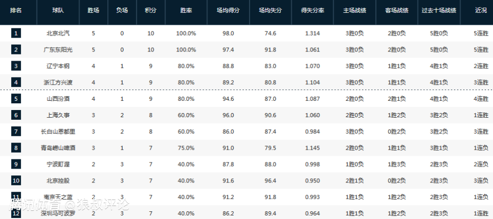 随着广东男篮击败广州男篮,新赛季开局拿到5连胜,成为联盟唯二的不败球队,另外一支5连胜球队则是北京男篮。