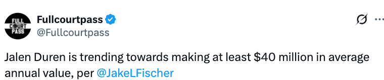 2025-12-24 01:00北京时间12月24日,据美记Jake Fischer报道,活塞中锋杜伦的新合同年薪预计将达到至少4000万美元。