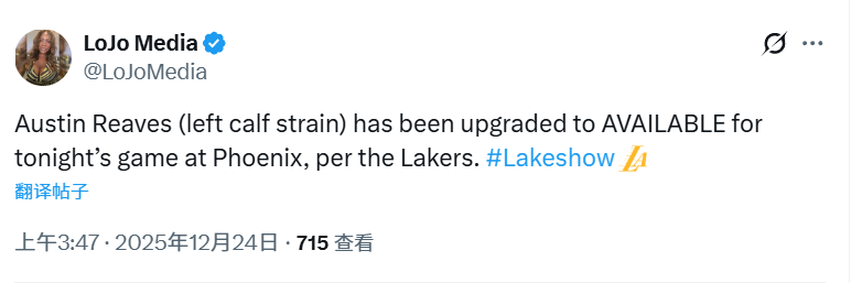 2025-12-24 05:50北京时间12月24日,湖人队在最新的伤病报告中确认,后卫奥斯汀-里夫斯的出战状态已升级为可以出战,他将在今日对阵太阳队的比赛中复出。
