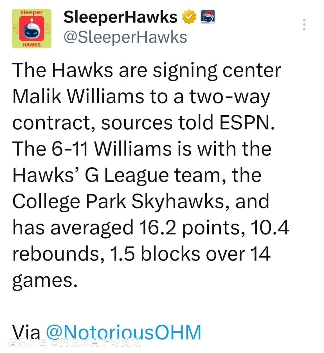 2025-12-24 06:10北京时间12月24日,据ESPN记者Ohm Youngmisuk报道,老鹰队已与中锋马利克-威廉姆斯达成一份双向合同协议。