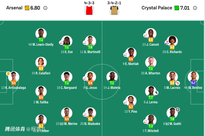 水晶宫首发:44-贝尼特斯、23-坎沃、26-理查兹、14-马特塔。