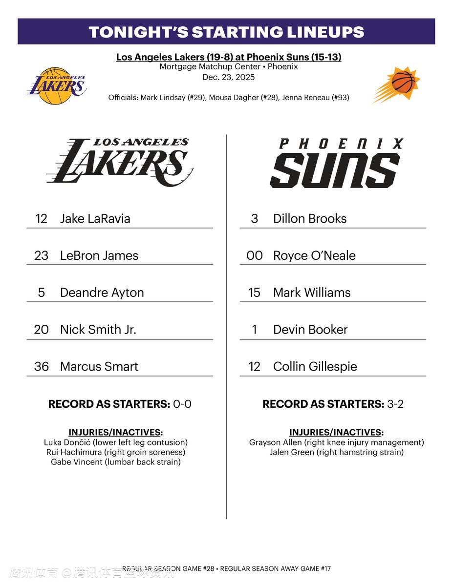 2025-12-24 10:00北京时间12月24日,NBA常规赛继续进行,湖人对阵太阳。赛前,两支球队分别公布本场比赛首发阵容名单,湖人方面詹姆斯单核带队,太阳方面布克领衔。值得一提的是,这是湖人本赛季第16套首发。里夫斯复出后变成替补。