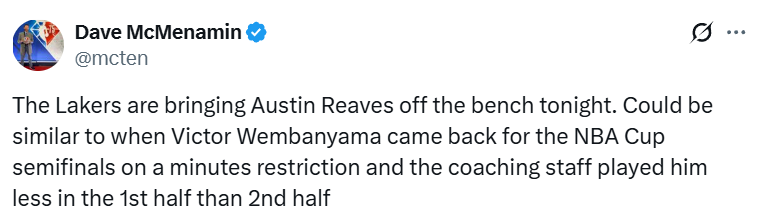 ESPN记者Dave McMenamin表示,湖人今日让里夫斯替补出战,此举或类似文班亚马此前征战NBA杯半决赛伤愈复出的模式,当时教练组为其设出场时间限制,上半场登场时间少于下半场。