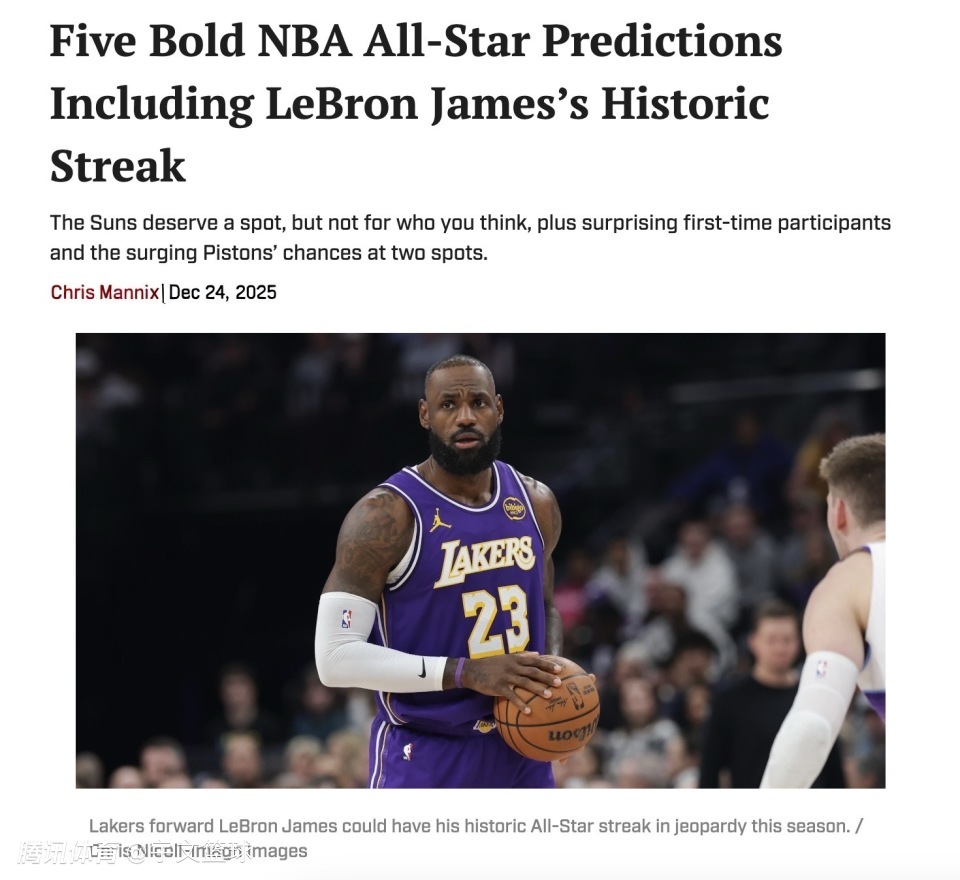 2025-12-24 10:20北京时间12月24日,美媒《体育画报》记者Chris Mannix撰写长文,对NBA25-26赛季的全明星阵容进行五项事件预测,其中包括詹姆斯遗憾落选,狄龙取代布克等大胆猜想。