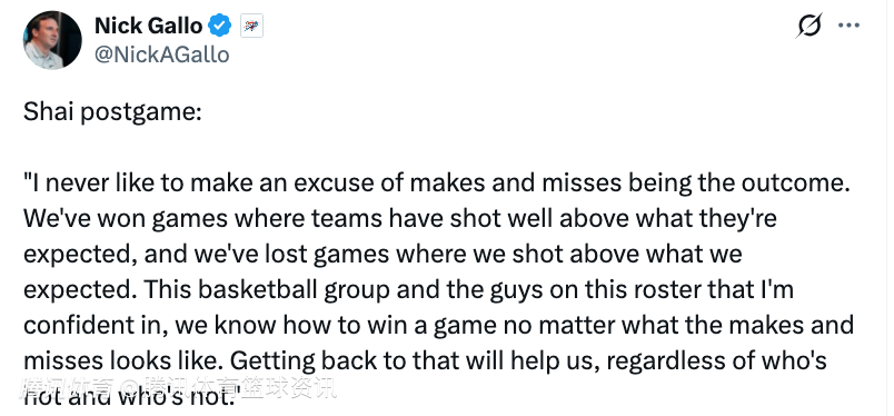 亚历山大表示:“我从不喜欢把投篮准不准当作比赛结果的借口。我们赢过对手投篮远超预期的比赛,也输过自己投篮超水平发挥的比赛。我信任这支球队和队友们,不管投篮状态如何,我们都知道该怎么赢球。找回这种赢球方式会帮到我们,不管谁手感好、谁手感差。”