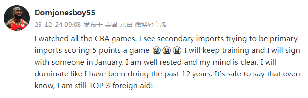 2025-12-24 20:40过去12个赛季都在CBA打球的外援多米尼克-琼斯再次更新社媒,重申自己是CBA前三的外援。他表示自己会在明年1月份签约回到CBA,他依然会像过去那样统治比赛。