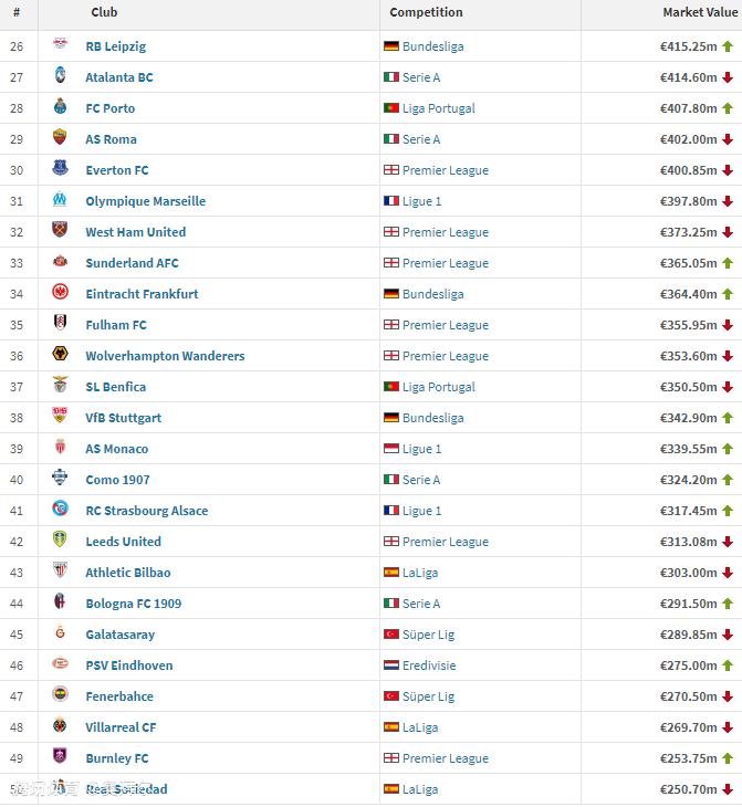 跻身前10的球队,还有排名第4位的巴黎圣日耳曼,排名第6位的巴萨以及排名第8位的拜仁。除了五大联赛球队之外,葡萄牙体育以4.63亿排名最高,但仅排名第23位。