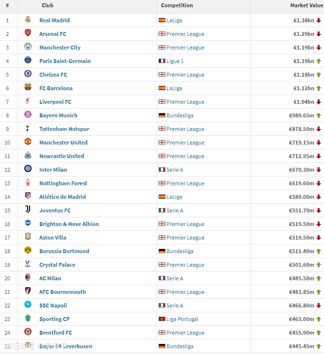 2025-12-24 20:40周三,《转会市场》公布2025年全世界身价最高的100支足球球队,皇马以13.8亿欧元排名榜首,阿森纳、曼城分别排名第2、3位。