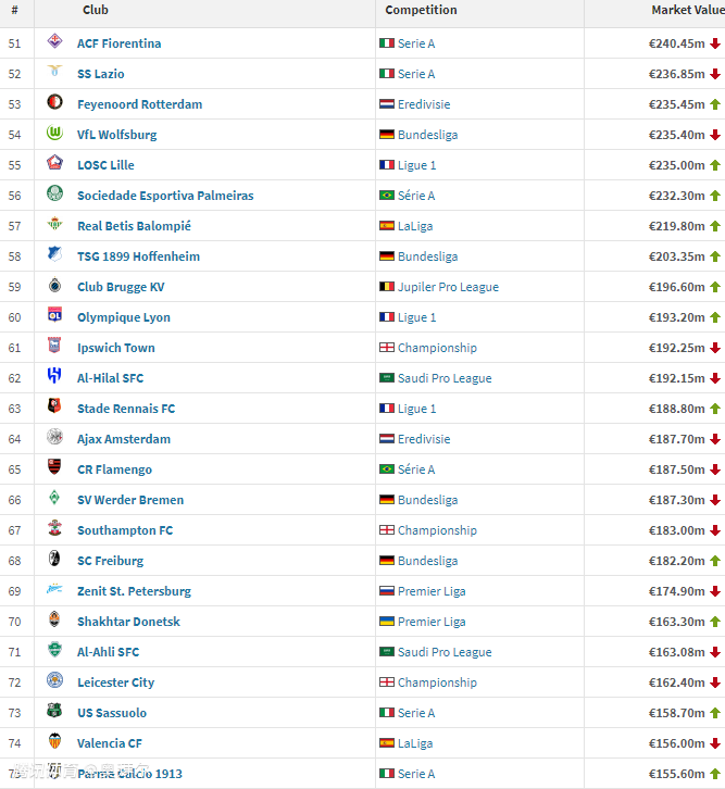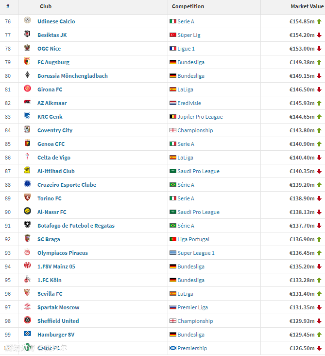 在亚洲球队里,利雅得新月排名最高,以1.92亿排名第62位,其次是吉达国民。