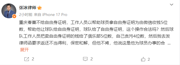 2025-12-24 22:20周三,律师张冰在社交媒体透露,重庆春蕾俱乐部工作人员“以帮助球员拿自由身证明为由微信收钱5位数”。