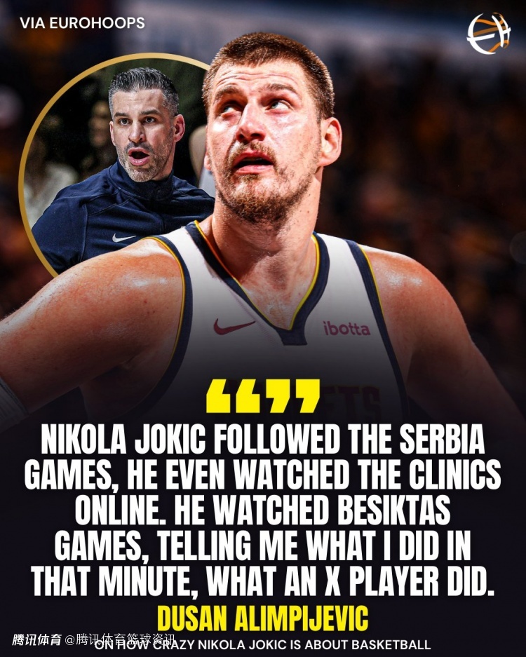 “约基奇一直关注着塞尔维亚国家队的动态,他甚至会回看球队的训练教学录像。” 身兼贝西克塔斯队主教练的阿里姆皮耶维奇补充道,“他还会特意去看贝西克塔斯的比赛,之后准确地告诉我,我在某一分钟做出了什么调整,队里的某某球员又完成了哪些关键动作。”