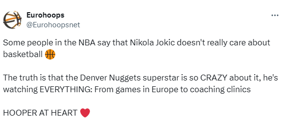 2025-12-25 06:30北京时间12月25日,据欧媒Eurohoops报道,针对NBA圈内流传的“约基奇并不真正热爱篮球”的说法,事实给出了截然相反的答案, 这位掘金核心不仅对篮球抱有极致痴迷,更是一位深入钻研赛事细节的“纯粹篮球人”。