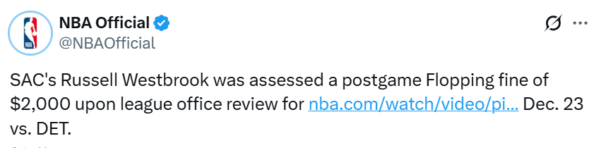 NBA官方:国王球员威斯布鲁克因假摔被罚款2000美元