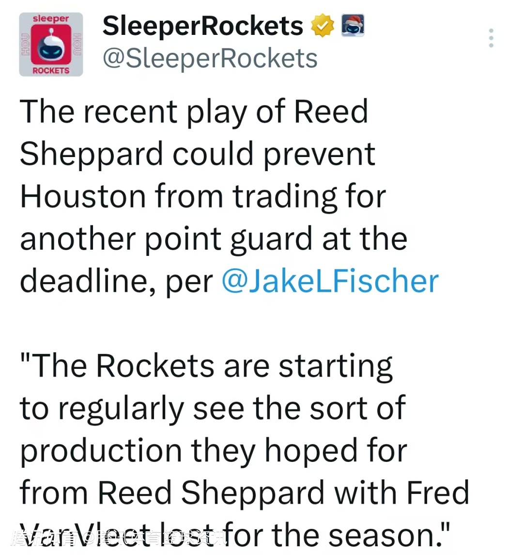 2025-12-25 10:10北京时间12月25日,根据名记Jake Fischer的报道,火箭或暂缓控卫引援,因球队对谢泼德近期表现相当满意。