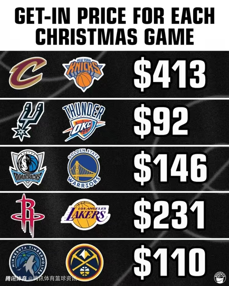 2025-12-25 11:00北京时间12月25日,美媒Buckets今日公布了明日NBA圣诞大战5组对决的最低票价,尼克斯主场对阵骑士的比赛最低票价也要413美元,排名第一。