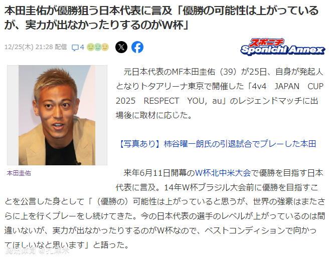 2025-12-25 21:00根据日本媒体的报道,前日本国脚本田圭佑在接受采访时表示,日本队世界杯夺冠的可能性增加,但世界杯的竞争非常残酷,希望日本球员以最佳状态参赛。