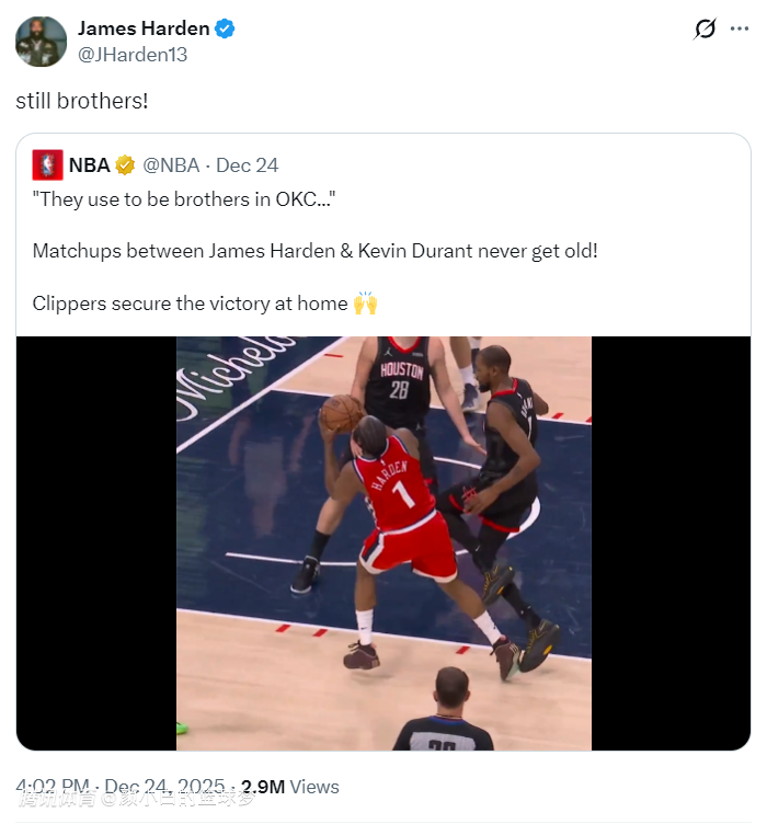 赛后NBA官方晒出哈登单打杜兰特的瞬间写道:两人以前是兄弟!哈登转推回应:我们现在也是兄弟。