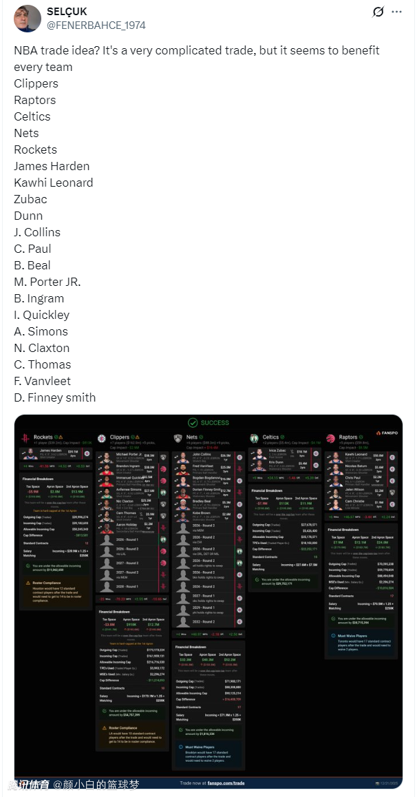 一位快船的球迷则觉得帮助哈登重返休斯顿的过程中LAC也可以直接重建,毕竟快船本赛季要实现泰伦卢所说的55场比赛赢下35场实在是太难,本赛季提前重建对未来更有益处,他模拟了一套超级五方交易,这笔交易涉及了多个选秀权。