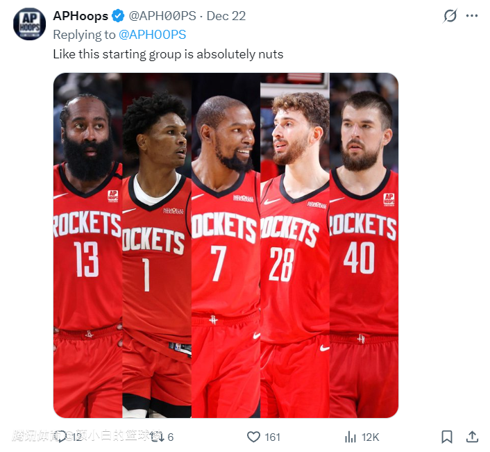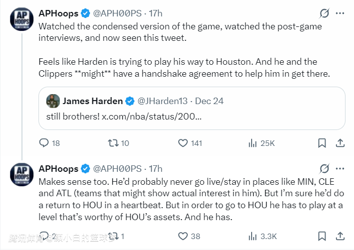 快船媒体APHoops赛后也转发了哈登说自己跟KD现在也是兄弟的推文,他写道:观看了比赛后哈登简短的采访,现在又看到了哈登这条推文,感觉哈登似乎在努力凭借自己的努力重返休斯顿,而且他跟快船之间似乎存在某种默契,都在努力送哈登回火箭。