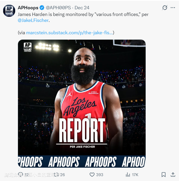 就在火箭VS快船的赛前,《露天看台》记者杰克-费舍尔刚刚报道,联盟多支球队都在关注哈登的动向,一旦快船真的愿意交易哈登,有球队愿意送出首轮签来换哈登。