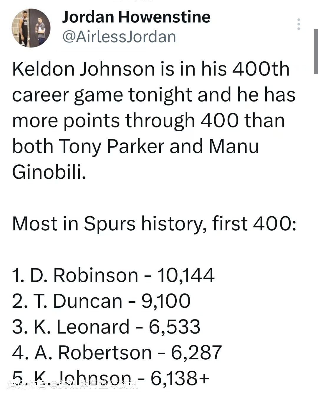 里程碑!凯尔登-约翰逊马刺生涯400场得分超GDP两巨头 跻身队史前5