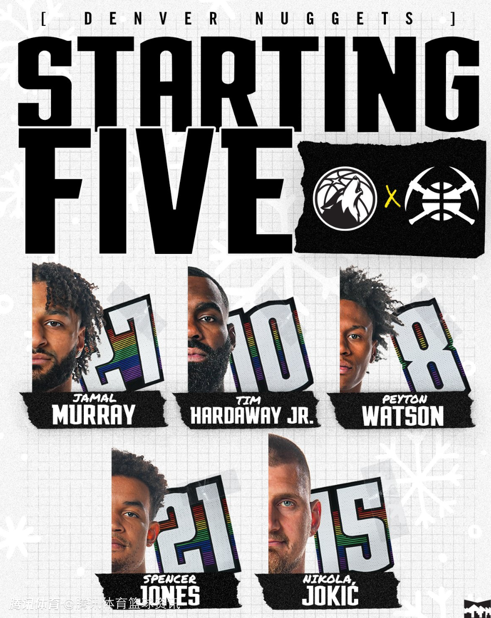 2025-12-26 11:20北京时间12月26日,NBA圣诞大战,掘金和森林狼的比赛将于今天上午11点30分打响,赛前双方公布了首发名单。