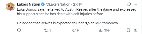 在谈到里夫斯的伤情时,东契奇透露,赛后他与里夫斯进行了交流,并向他表达了支持。因为东契奇此前也曾遭遇过小腿伤势。他补充道,里夫斯预计将于明天接受核磁共振检查。