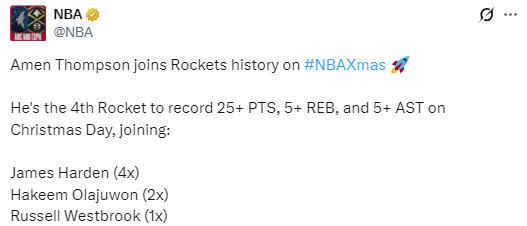 阿门-汤普森则成为了火箭队史上第4位能在圣诞大战中单场得到至少25分5篮板5助攻的球员,前三位球员分别是哈登。