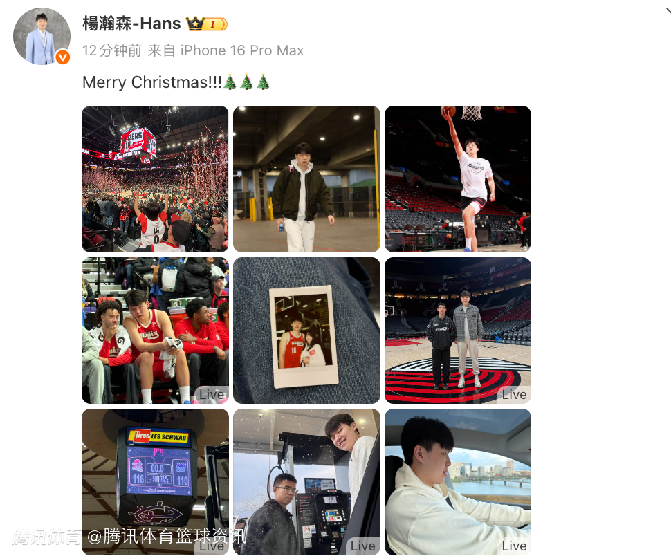 2025-12-26 13:40北京时间12月26日,今天是美国当地时间的圣诞节,开拓者球员杨瀚森更新社媒,晒出自己在美国的组照,其中将自己和女友拍立得的照片放在了C位,配文写道:“Merry Christmas!!!”