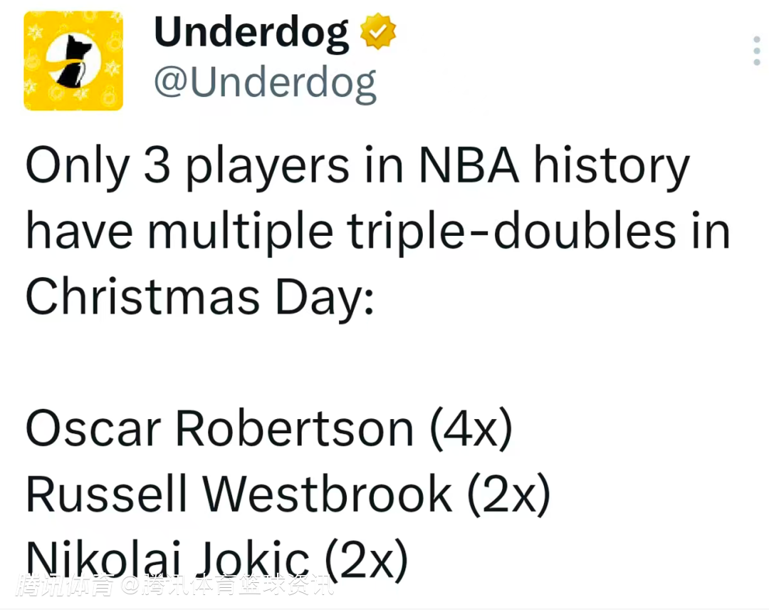 根据数据统计显示,约基奇生涯圣诞大战已2次斩获三双,与威少并列历史第二,仅次于奥斯卡-罗伯特森的4次。