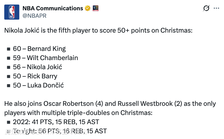 此外,约基奇成为了圣诞大战中第五位单场得分50+的球员: