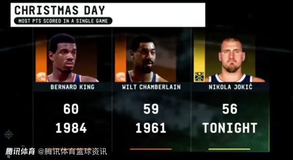 本场比赛,约基奇首发出战42分钟,投篮21中15,三分球6中4,罚球23中22,拿到56分16篮板15助攻2盖帽。这56分是本赛季最高分,同时也是圣诞大战历史第三高分(伯纳德-金曾在1984年拿到60分、张伯伦在1961年拿到59分),据统计,约基奇是NBA历史上首位单场轰下55+15+15的球员,同时也是历史上首个多次拿下55+三双的球员,另外也是NBA历史上最高效的50+三双(本场比赛真实命中率高达90%)。
