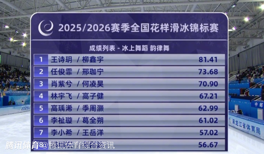 2025-12-26 15:40北京时间12月26日,2025-2026赛季全国花样滑冰锦标赛冰舞韵律舞比赛,在第二组最后登场的王诗玥/柳鑫宇获得81.41分,位列第一名,李祉璇/葛全朔以61.02分位列第二名,李小希/王岳洋以57.02分排在第三名。