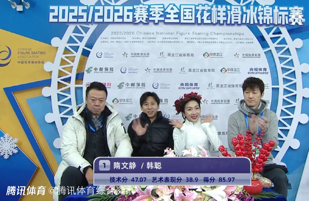 2025-12-26 19:20北京时间12月26日,2025-2026赛季全国花样滑冰锦标赛双人滑短节目比赛,隋文静/韩聪作为首个登场组合,获得85.97分,暂列第一名。