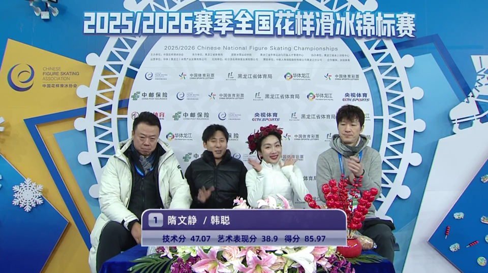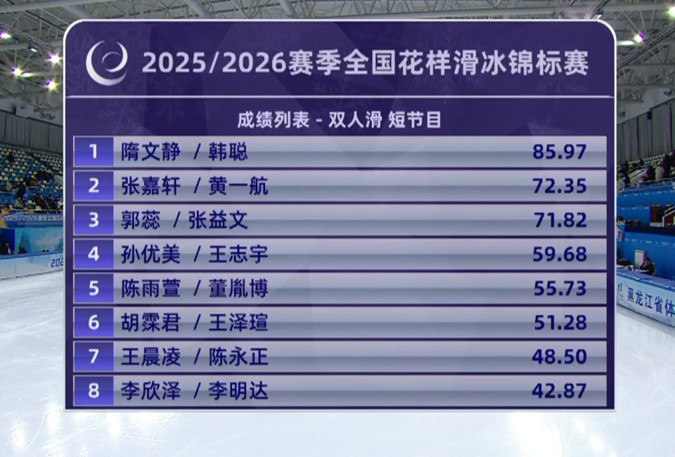 2025-12-26 21:202025全国花滑锦标赛在哈尔滨揭开战幕,在刚刚结束的双人短节目里,隋文静/韩聪以近乎完美的表现,拿到85.97的超高分,无可争议领跑!